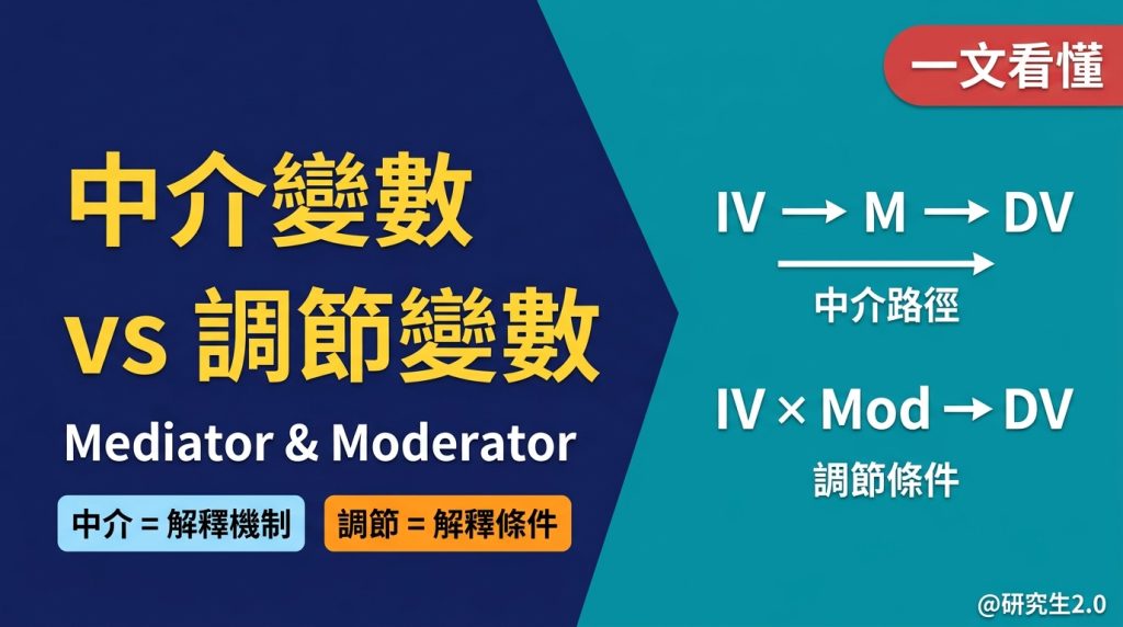 Mediator = IV 透過什麼影響 DV(機制) Moderator = IV 對 DV 的影響在什麼條件下改變(邊界)